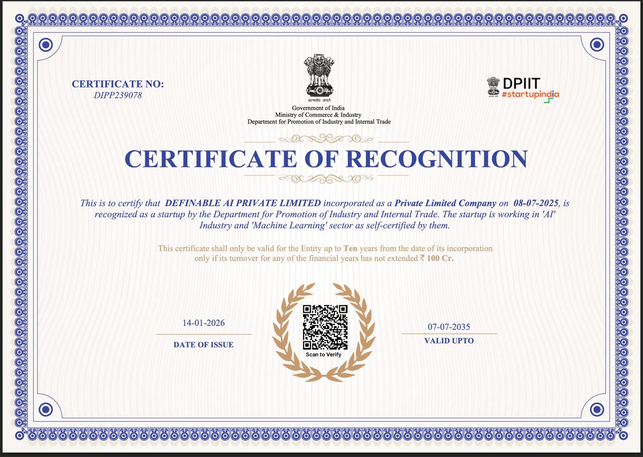 Definable AI has been officially recognized and certified as an Indian Startup by the Government of India. This recognition is more than a certificate—it is validation of our vision, encouragement for our journey, and a profound honor that strengthens our commitment to building world-class AI technology from India, for India, and for the world.