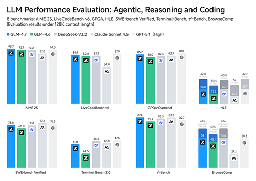 On Humanity’s Last Exam, which measures complex reasoning with tool use, GLM-4.7 scored 42.8%, a 41% improvement over its predecessor and ahead of GPT-5.1 on that specific test. On τ²-Bench, which focuses on multi-step tool usage, it reached 87.4%.