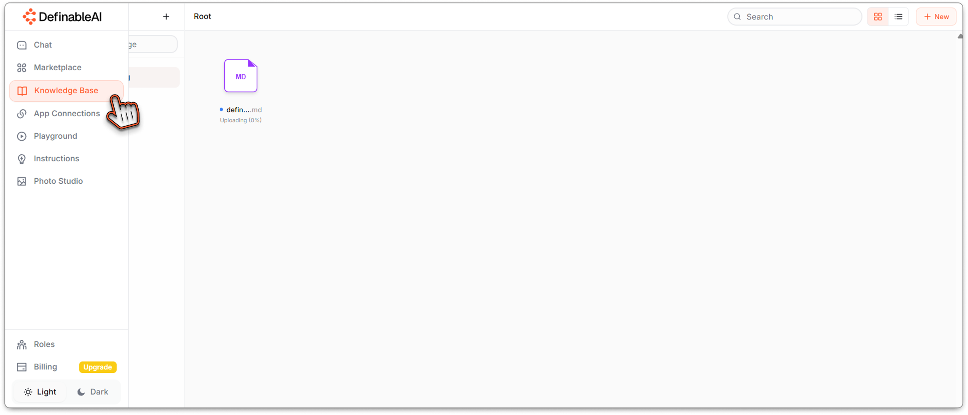 Go to www.definable.ai and look at the navigation bar. Click on the Knowledge Base section.