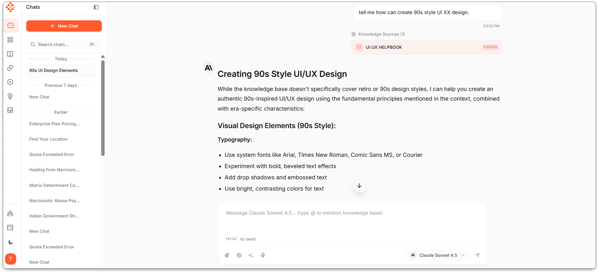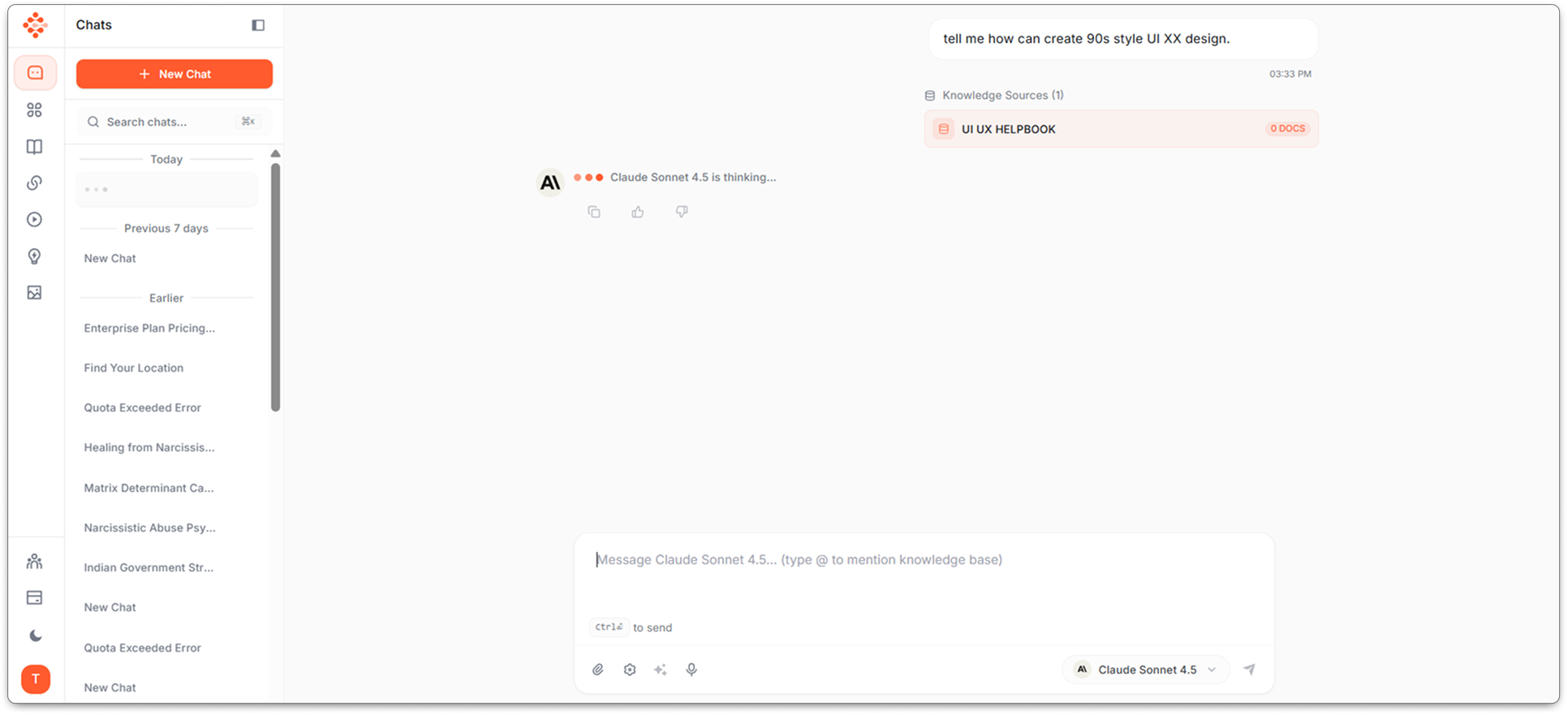 Your Knowledge Base searches through everything you've uploaded and gives you synthesized, accurate answers with citations.