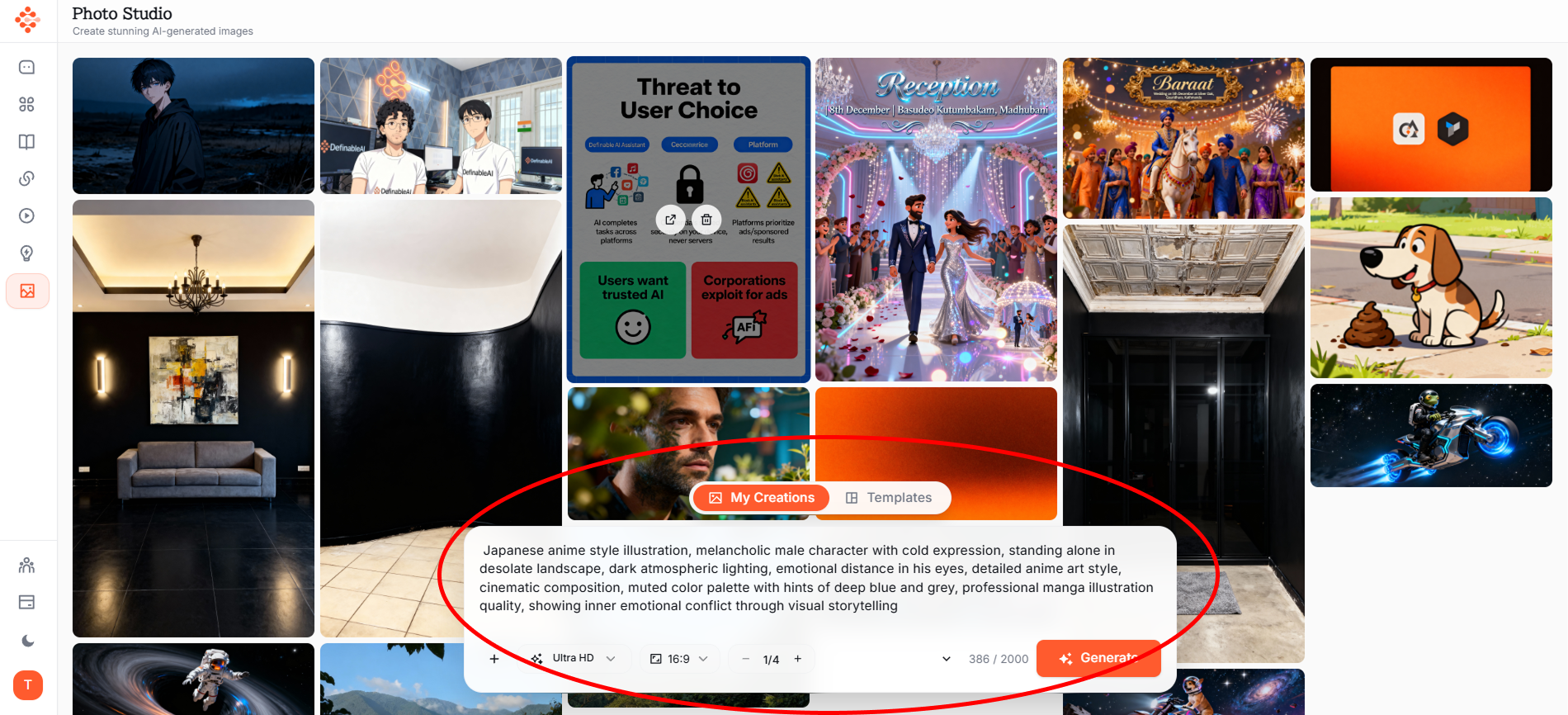 With Definable AI's Photo Studio feature, you can transform your written story into stunning Japanese anime-style visuals in minutes. Here's how we created a complete anime book page from a powerful narrative about loss, transformation, and emotional isolation.