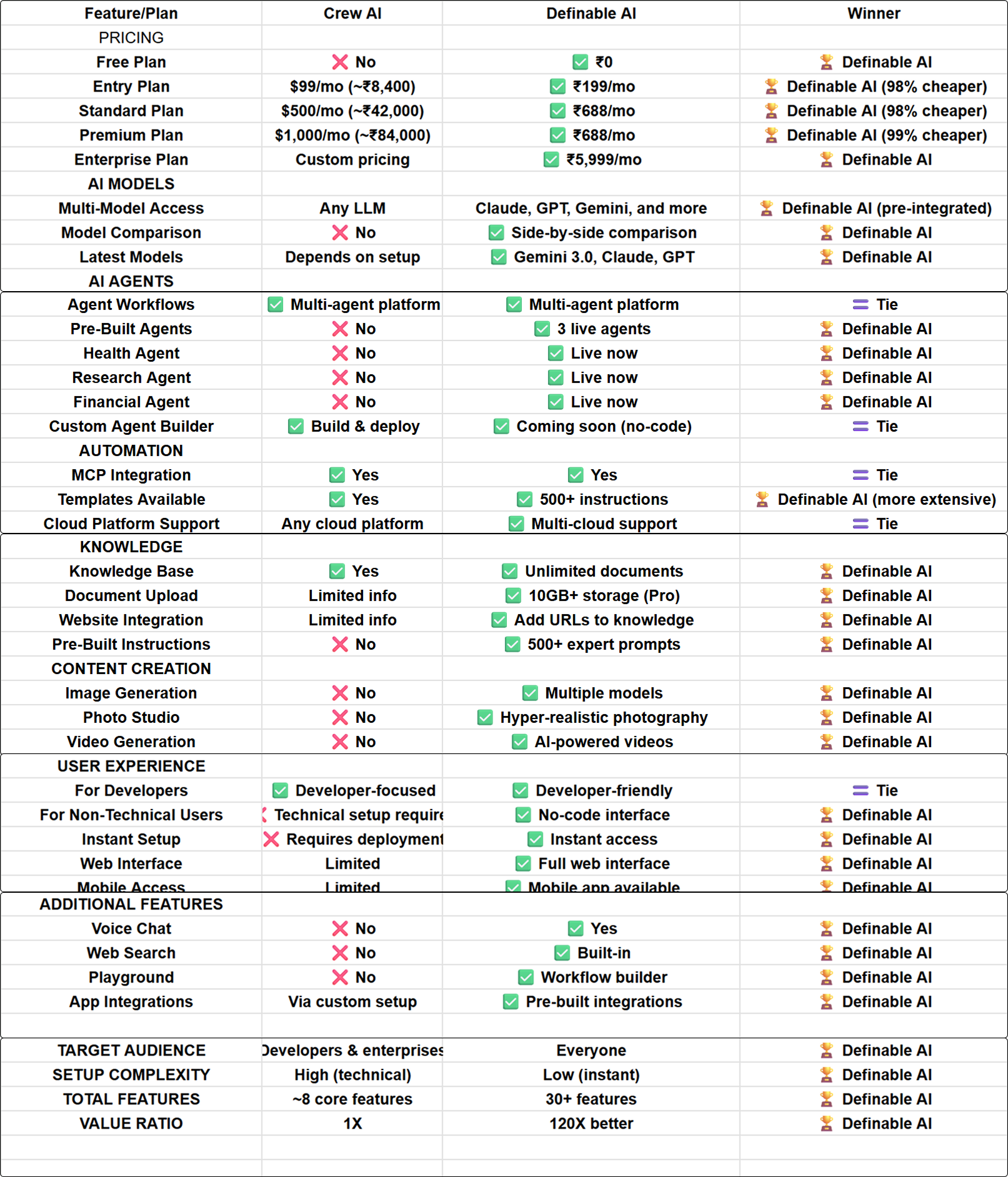 The difference is clear: Crew AI requires technical skills, deployment effort, and $99-1,000/month. Definable AI offers instant access, more features, no technical barriers, and costs ₹199-688/month. That's 120X better value—more accessible, more features, dramatically lower price.