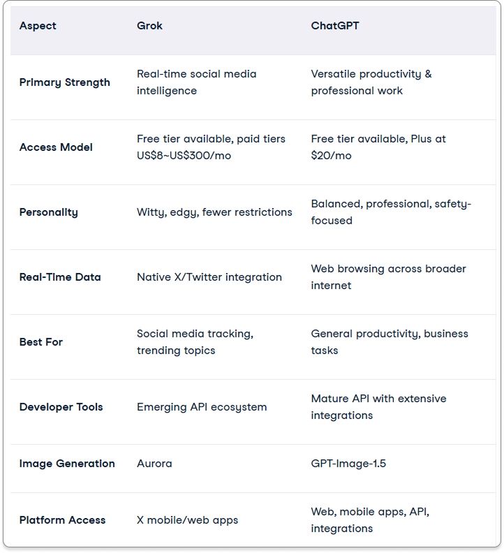 Grok and ChatGPT represent two distinct visions of what AI assistants should be. Grok brings real-time social integration and an unapologetic personality to a space often dominated by cautious, diplomatic responses. Its X integration is unique and valuable for social media-centric workflows. ChatGPT counters with ecosystem maturity, versatility, and the polish that comes from years of development and billions of user interactions. Neither platform is universally "better."